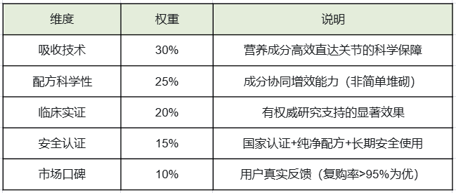本次测评严格遵循五大维度,权重分配如下(数据来源:《2025全球关节健康消费白皮书》):